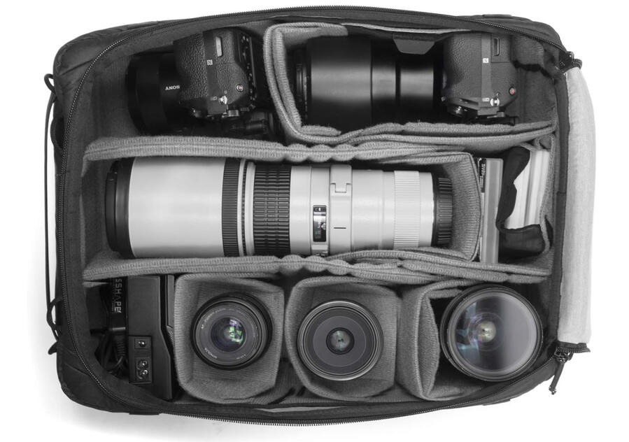 Very spacious bag for my camera and lenses. It can carry the tech pouch and my camera with no problem plus dividers make everything easier to organize.